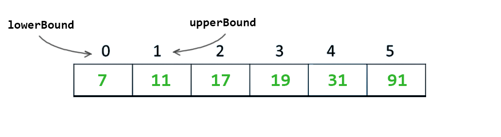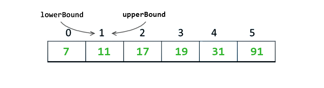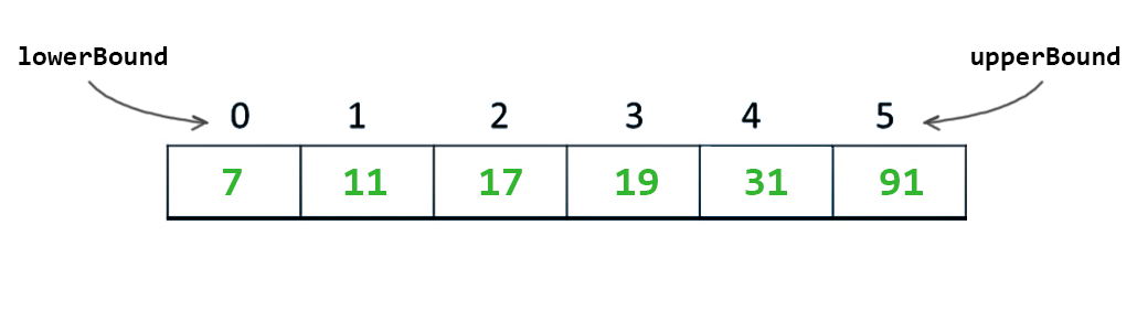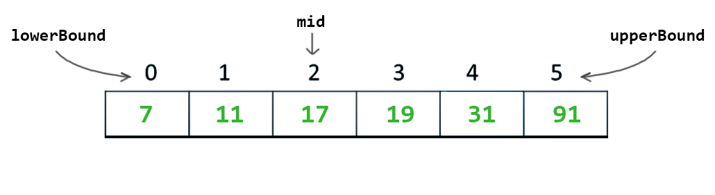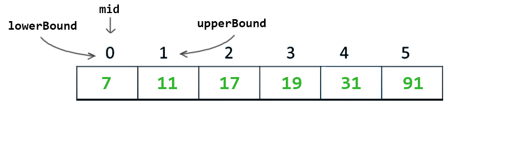 Binary search ilk olarak alt sınırı (lowerBound) ve üst sınırı (upperBound) ifade eden 2 adet işaretçi kullanır.