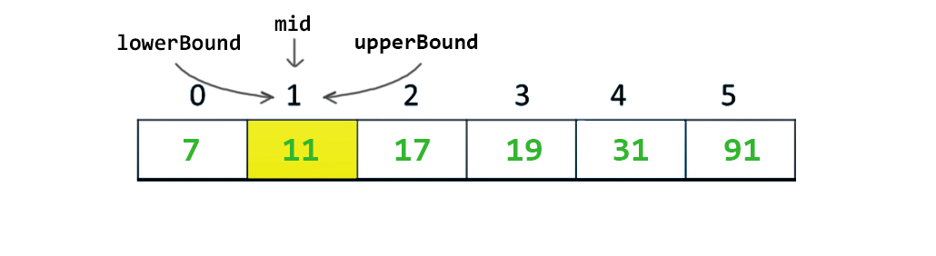 Bu sefer mid deki değer 7 ama benim aradığım 11 idi. Yani mid den büyüğüm. O zaman algoritma kesin ben mid in sağındayımdır düşüncesi ile, lowerBound u mid + 1 konumuna çeker.