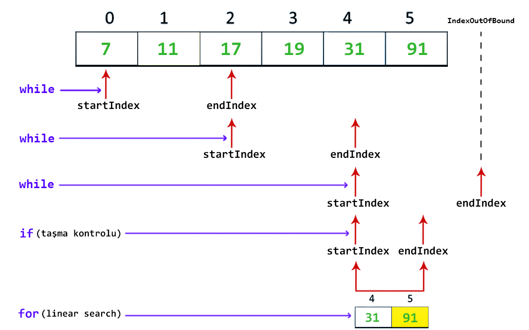 Son olarak ilgili blok tespiti sonrası blok sınırlarımız [startIndex, endIndex] içerisinde linear search uyguluyoruz. Sonrasında eğer bu aralıkta aradığımız değeri tespit edersek mutlu son, tespit edemezsek aradığımız elemanın bu koleksiyonda olmadığı sonucuna varıyoruz. Yukarıdaki örneğe dönecek olursak [4,5] sınır değerlerine sahip bloğu taradığımızda aradığımız 91 değerinin 5. indexte olduğunu tespit etmiş oluyoruz.